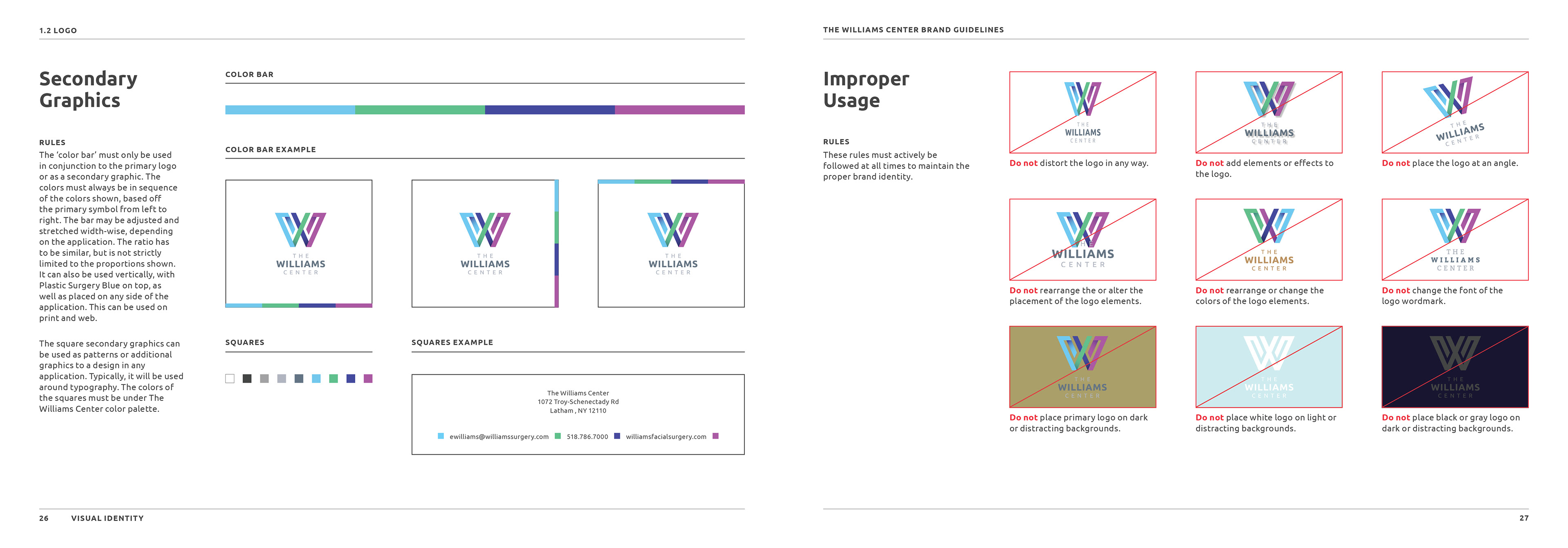 Identity Rebrand for The Williams Center. This was an ambitious rebrand of a very established medical group. Starting with the logo, I created a modern and recognizable symbol that focuses in on the "W" of Williams that is separated into 4 colors. Each color represents the 4 doctors and the 4 branches of Williams. The "X" shape in the middle symbolizes that each branch crosses together and works together as a whole. What followed after was an entire system that followed these colors and branches for any application, whether it be print or digital. It would be very easy to use them cohesively, as well as separate when needed.